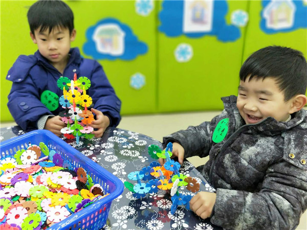 婴儿们很高兴把雪花做成各种形状。(7)把豆子放进去——快来碗里