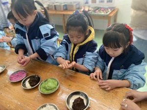 课间练习赛结束后,各班老师带领孩子回班开展“搓饺子、品饺子”活动。